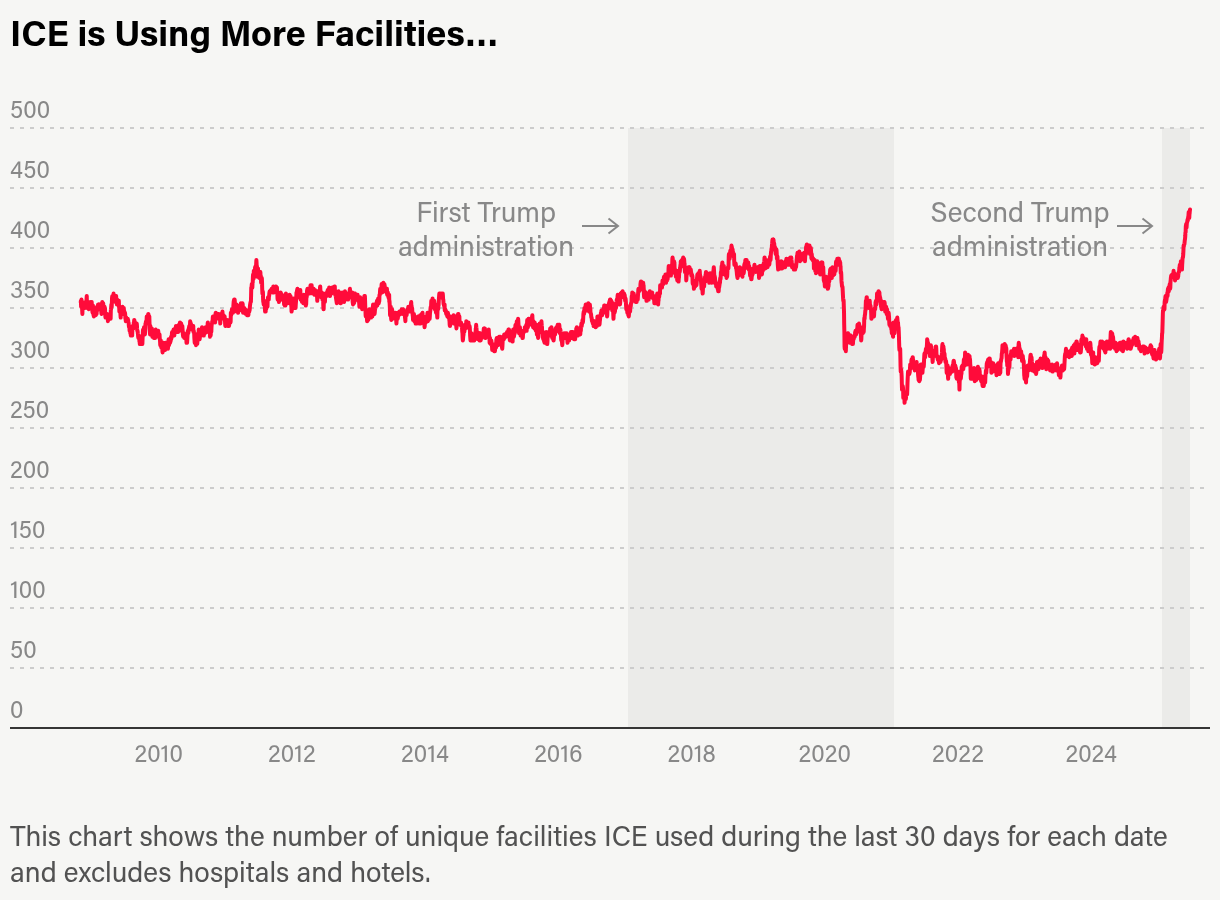 The Marshall Project analyzed ICE detention data provided by the Deportation Data Project and processed by the Vera Institute of Justice and found that from late May to late June, ICE had used 432 facilities to hold immigrants, up from 315 over the month leading up to Trump’s second inauguration. Since Jan. 20, ICE has put people in at least 45 facilities that had not detained immigrants in more than a decade of available data.