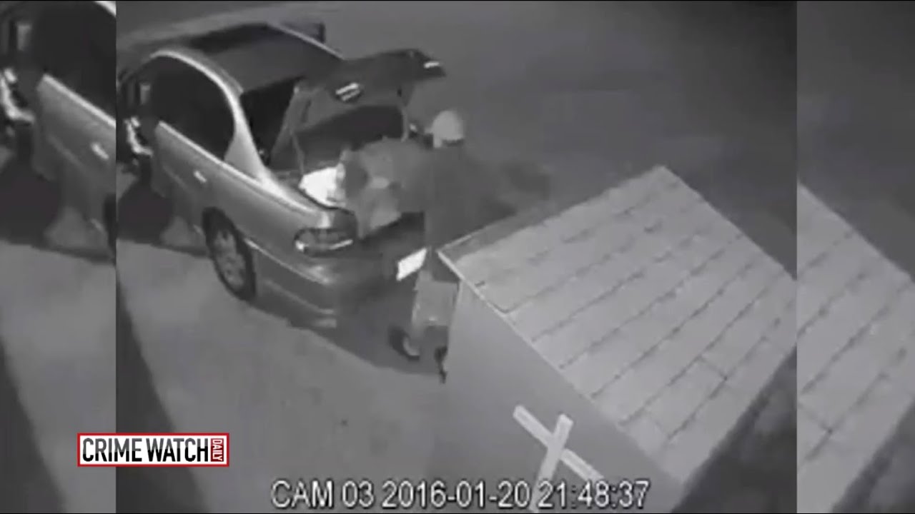Two suspects are seen on camera backing their car up to a donation bin and stuffing the contents inside the trunk.