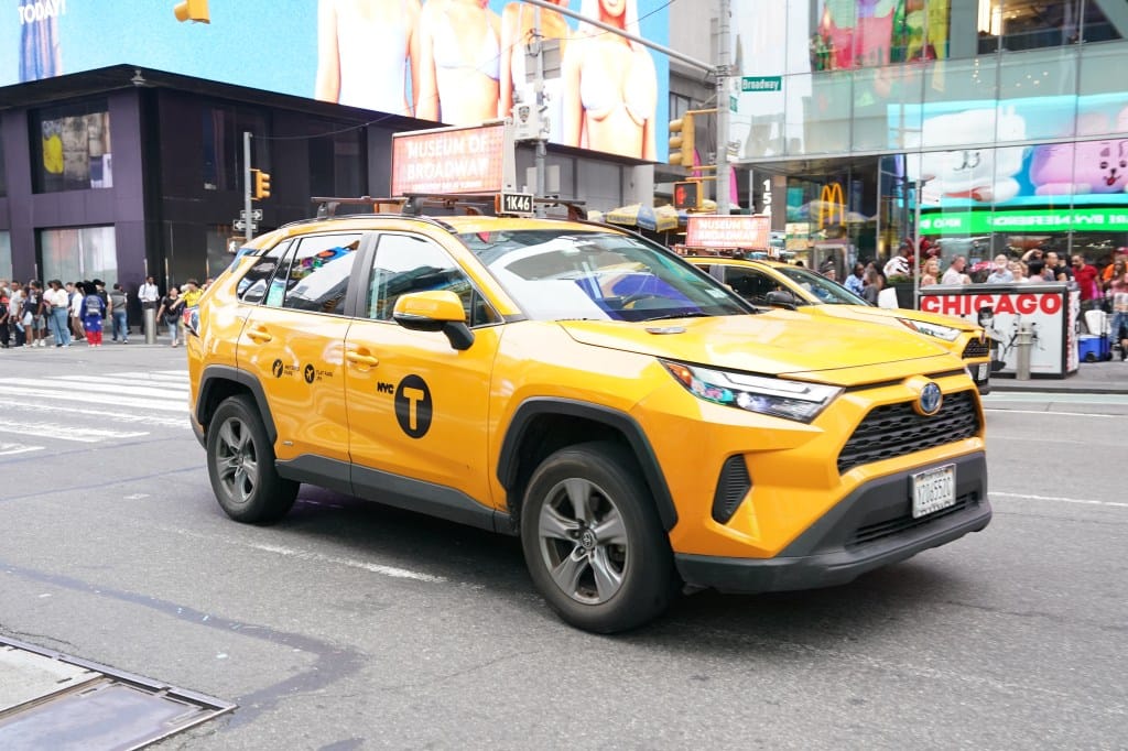 A general view of yellow taxis or yellow cabs as seen in the Times Square section of New York, NY on June 13, 2025.