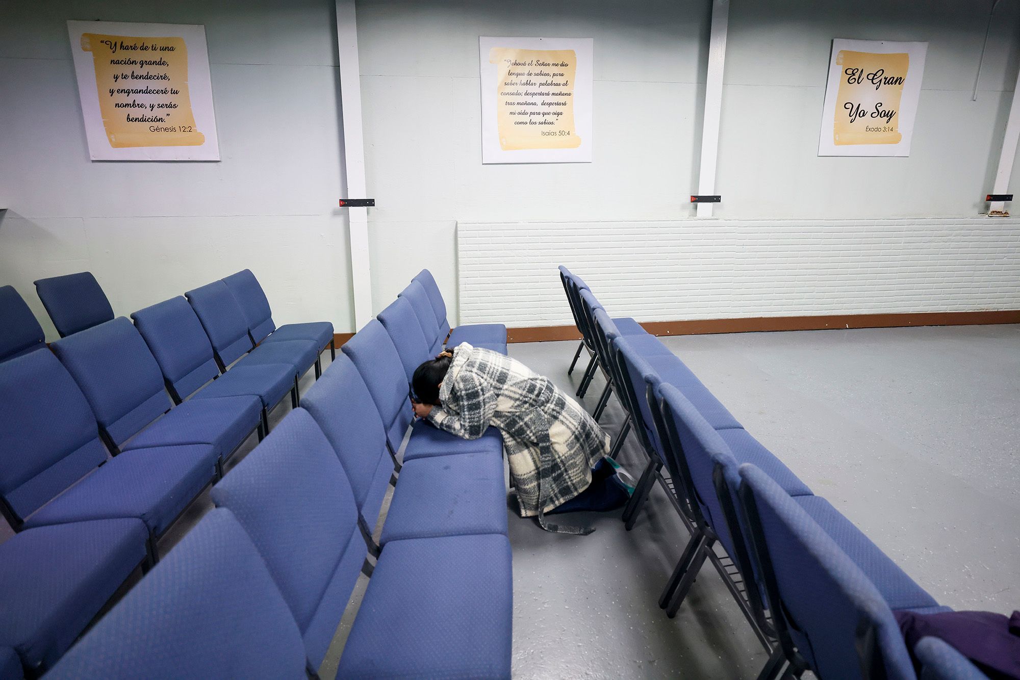 A woman, wearing a black and white plaid jacket, kneels in between a row of blue chairs. Three signs of Bible verses translated into Spanish hang on the wall.