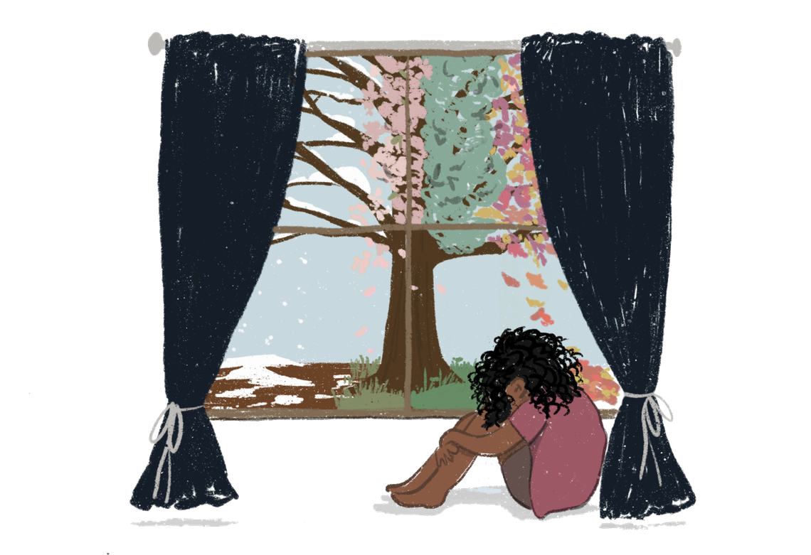 An illustration shows a brown person sitting on the floor with their head on their knees. They sit by a window with curtains. A tree shows a change of seasons, from winter to spring, outside the window.