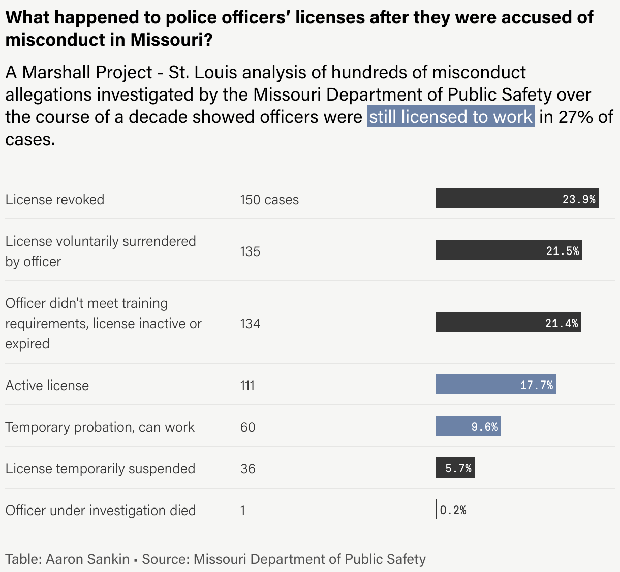 A table breaking down the distribution of outcomes for the licenses of officers investigated by Missouri's Peace Officer Standards and Training Program. It shows that, in 27% of cases, the officers investigated are still able to work.