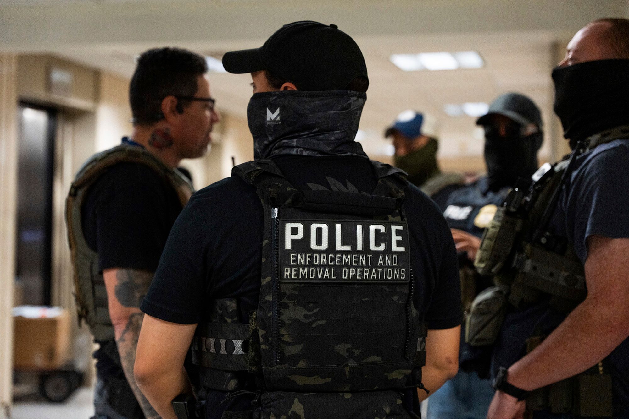 Immigration and Customs Enforcement officers wait in Federal Plaza Immigration Court in New York City to detain noncitizens after their status hearings, regardless of the judges’ ruling, in June 2025.