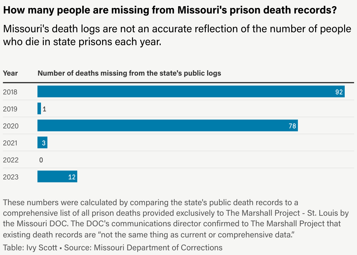 The new report revealed how severely Missouri’s prison deaths had been undercounted: The original death log our team received listed 15 people who died in Missouri state prisons in 2018. The actual total is 107.