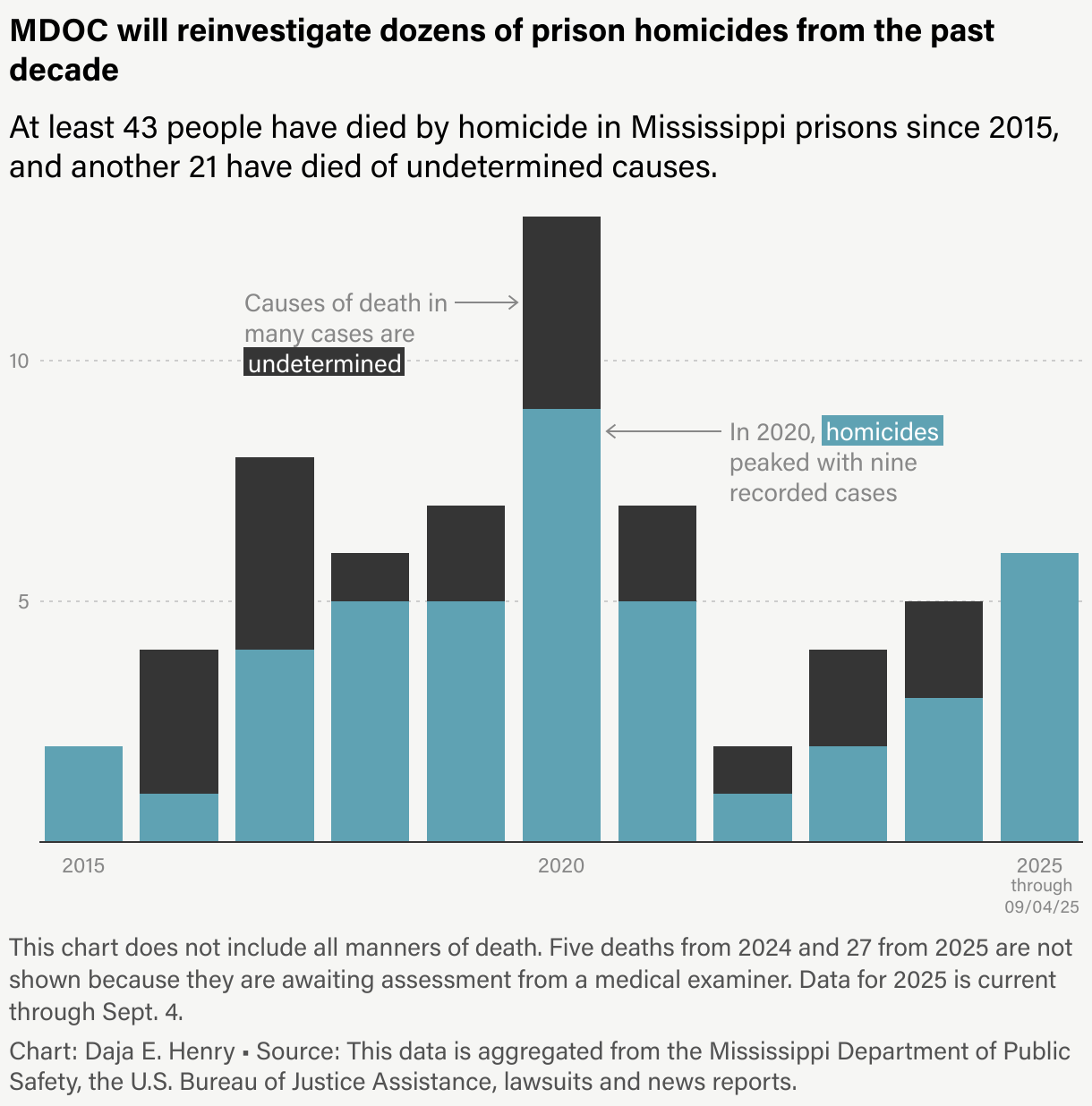 In addition to the 43 homicides, another 21 prisoner deaths since 2015 have been ruled “undetermined” by the state medical examiner’s office. That means medical examiners were not able to come to a conclusive answer about how a person died. An undetermined death could be a homicide, suicide, accidental, or a natural death.