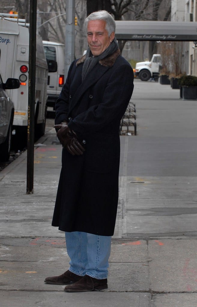 Jeffrey Epstein stands on a sidewalk, wearing a long dark coat, jeans, and brown gloves.
