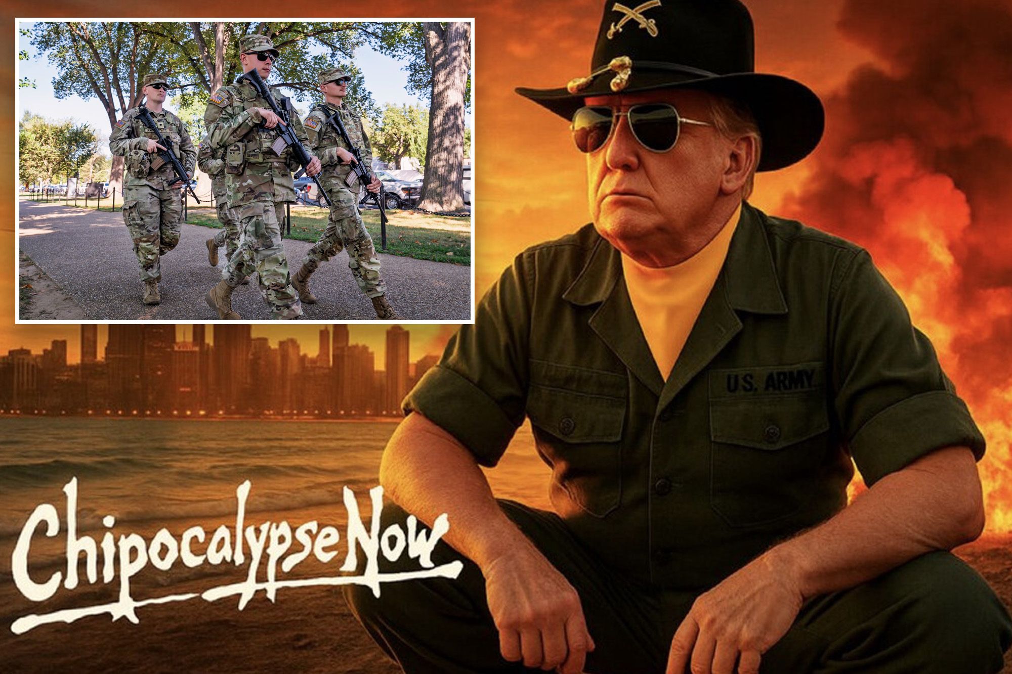 The post was accompanied by an AI picture of Trump seated with fire and helicopters with the Chicago skyline in the background, dressed as the character Robert Duvall played in the movie “Apocalypse Now.”