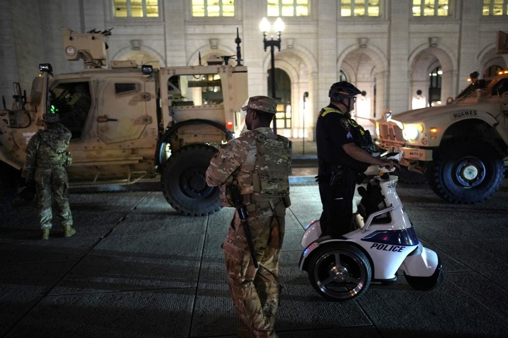 National Guard and police officers patrolling Washington, D.C. at night.