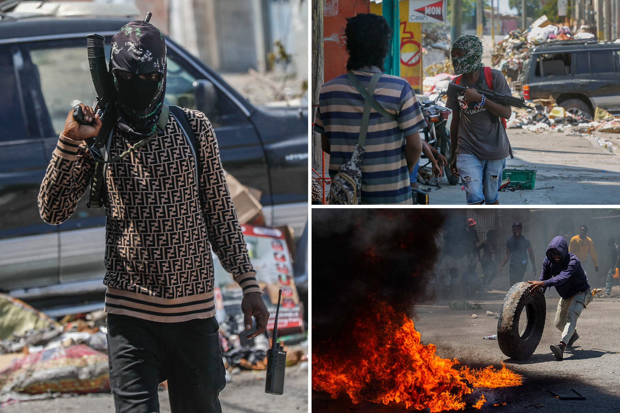 Armed members of the G9 and Family gang stand guard at their roadblock in the Delmas 6 neighborhood of Port-au-Prince, Haiti, in March 2024. AP