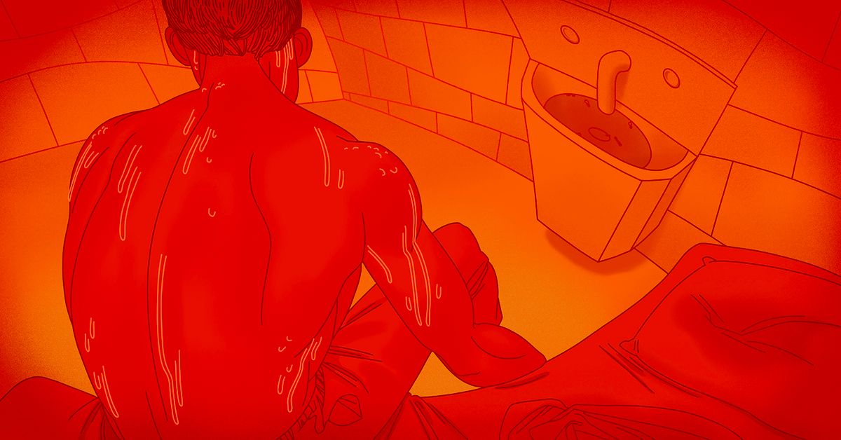 Even as I lay here writing this, I have a cold rag on my chest and it’s almost dry already. I just dunked it in the nasty sink water — it stinks, but it’s all we got to cool off with.