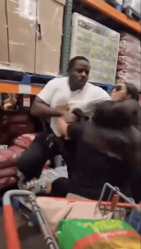 Man in white shirt punching a woman, with another woman on the ground, in what appears to be a Costco aisle.